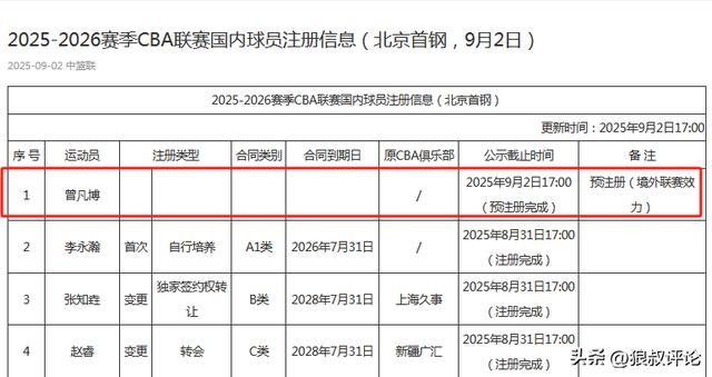 从目前的处境来看,曾凡博没有足够健康的身体状态,继续冲击NBA希望不大的情况下,返回CBA联赛概率是相对比较大于其他可能性。原因比较简单,北京男篮已经对曾凡博进行了预注册,25-26赛季12月份才正式开打。